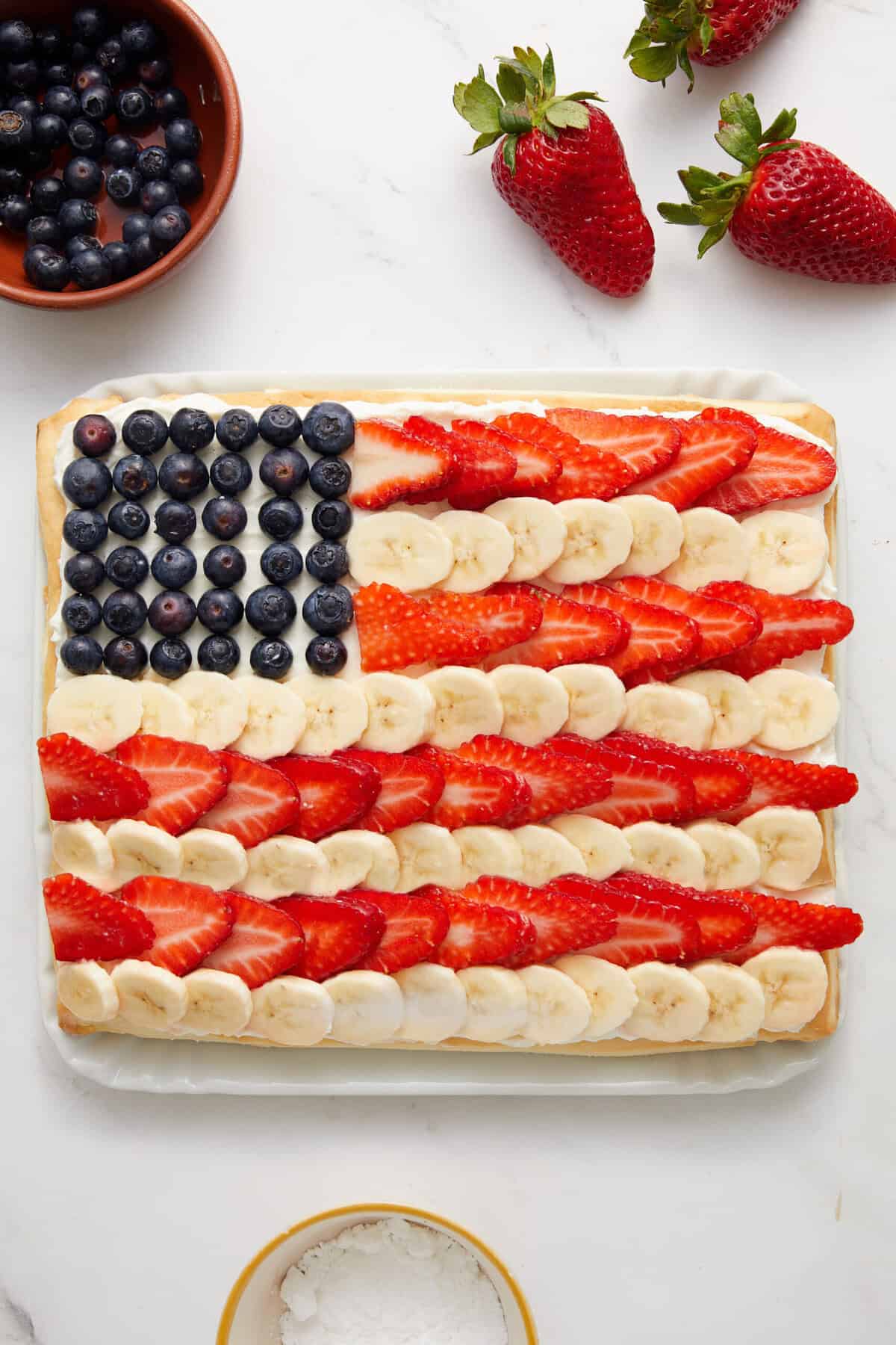 This 4th of July fruit pizza does have some nutritional value, thanks to the hefty amount of fresh fruit it contains. It is bursting with ripe strawberries, blueberries, and delicious banana slices. However, the sugar quantity is quite high, and it also contains cream cheese and butter, both of which are high in fat. You can cut down on some of the fat by using fat-free or low-fat cream cheese, though the dish won’t be quite as rich. This pizza can also be made gluten-free by using a gluten-free sugar cookie dough for the base. You can also switch to a plant-based cream cheese and butter and a dairy-free sugar cookie dough to make it dairy-free.