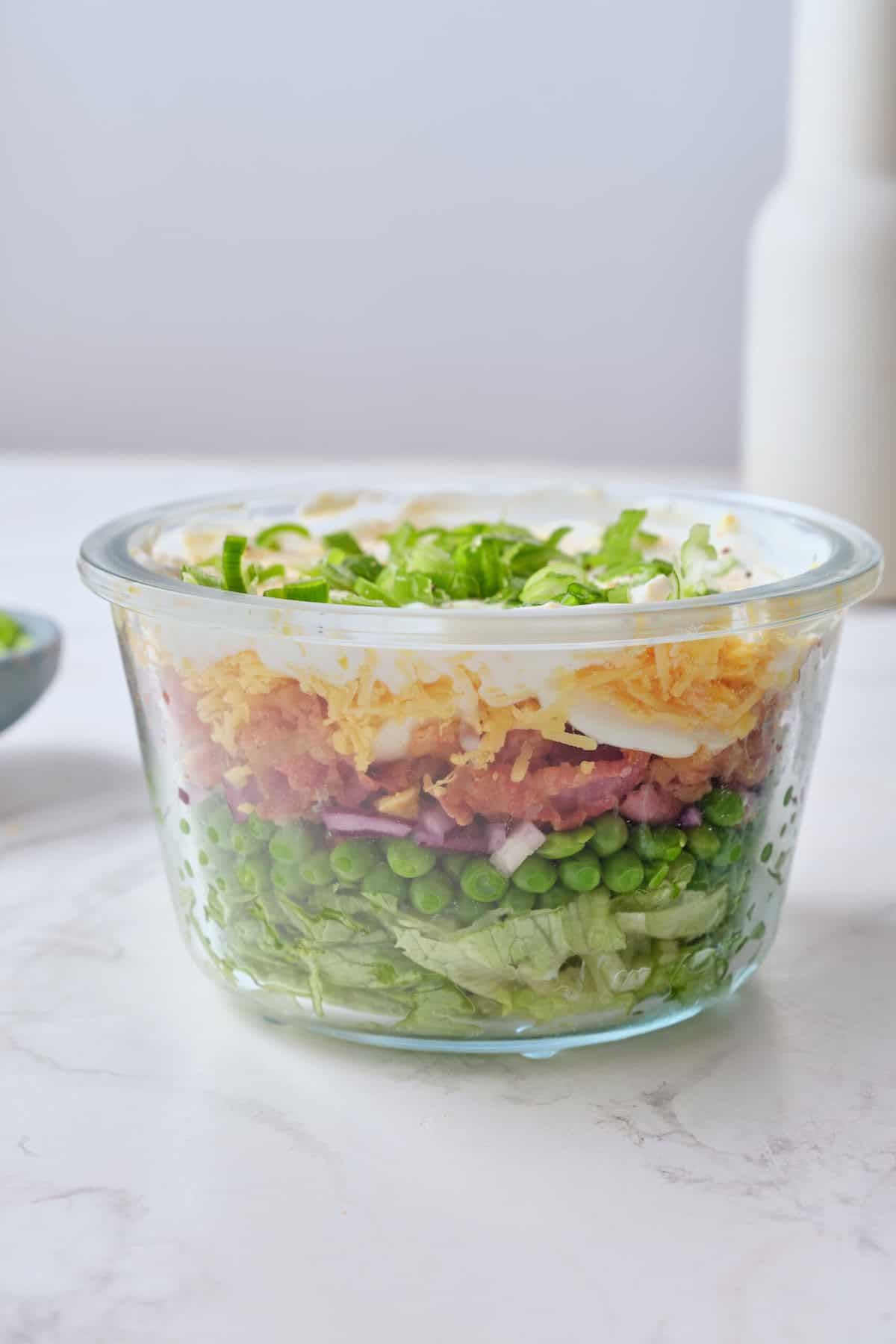 To make sure your layers are beautifully displayed, start by placing each ingredient on the outside of the bowl first, then work your way in. You want a kind of u0022rainbowu0022 effect, where each layer blends smoothly into the next. When placing the eggs, press them lightly against the sides of the dish so they’re visible. When you spread the dressing on top, use a baking spatula or the back of a spoon to swirl it like frosting. Lastly, don’t skimp on the garnish! Your 7-layer salad deserves to look as good from the top as it does from the sides.