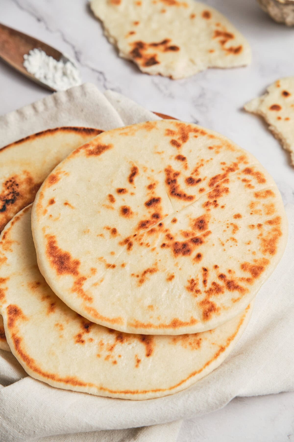 Despite often being referred to as a ‘flatbread’, this Turkish specialty actually uses yeast as a leavening agent. This, combined with the Greek yogurt, leads to a thick flatbread that pulls apart easily and is ideal for dipping in sauces. In Turkey, thicker bazlama are often cut in half and used to make sandwiches. Although this modernized recipe calls for a simple pan-frying cooking method, this Turkish flatbread was traditionally cooked on a type of pan called a saç. This pan looks like an upside-down wok and gives traditional Turkish flatbread its slightly curved shape.
