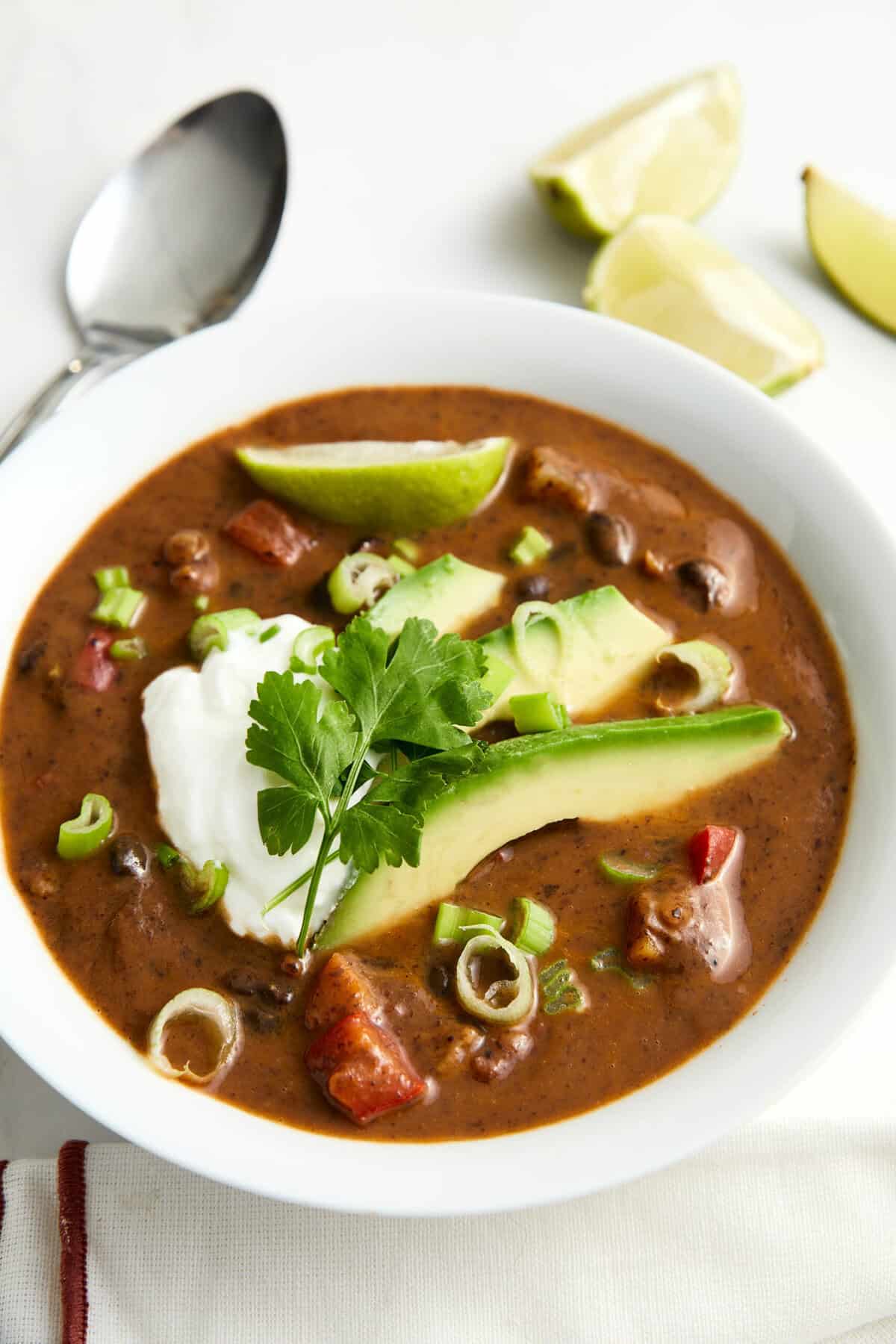 You could top this soup with avocado, lime, cilantro, and Tortilla Strips before serving it with dishes like Healthy Chicken Quesadilla. For vegetarian options, try pairing this soup with Street Corn or Mexican Chopped Salad. Black bean soup also makes a fine dip for Keto Tortilla Chips!