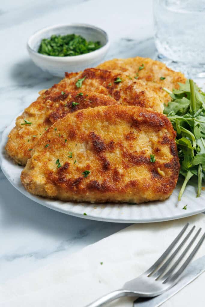 I particularly love how quickly this meal comes together. It’s easy enough to do on a weeknight—but so impressive looking and tasting that I like to serve it when my partner’s parents come over for dinner. I typically use hot paprika because I like a little more heat. It’s fun experimenting with different herbs and spices in the breading for nearly endless flavor profiles!