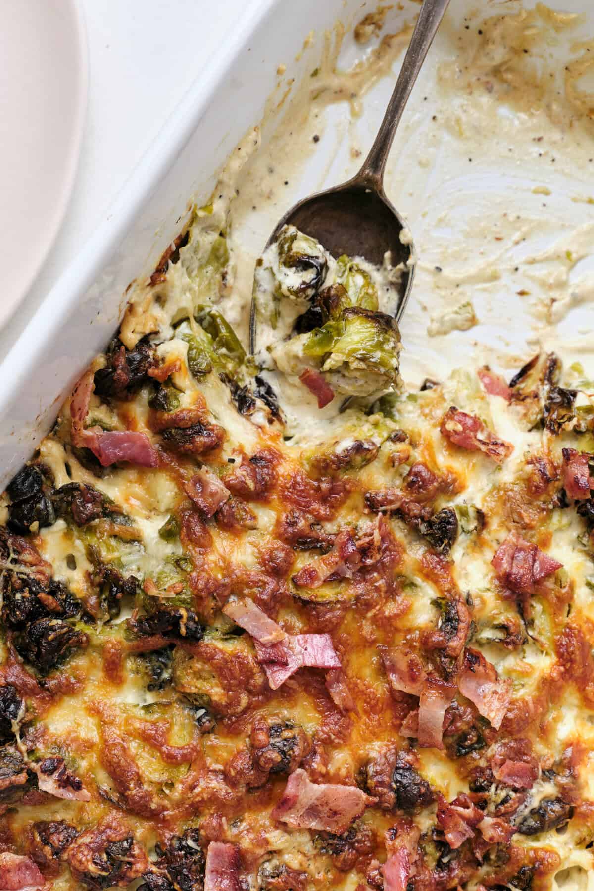 The trick to its irresistible taste and texture is in the velvety cheese sauce. Slowly but surely, this thick and smooth combo of roux, white wine, heavy cream, chicken broth, and seasonings bakes into the Brussels sprouts, bathing them in fabulous flavors. Then, a topping of melty Gruyère cheese and smoked crispy bacon bits brings the whole dish together. Get ready to say “goodbye” to bland or bitter Brussels sprouts! This recipe makes them taste positively indulgent.