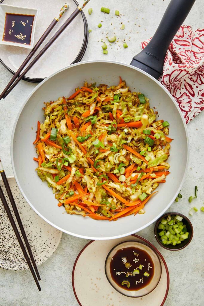 Cabbage may be the most underrated vegetable. It’s rich in vitamins C and K, fiber, and antioxidants. It’s a very filling vegetable, too, so you’re more likely to feel satisfied without overdoing it with this recipe. Plus, this stir-fry is naturally vegan, dairy-free, and gluten-free—if you use gluten-free soy sauce or tamari. With low calories, high fiber content, and lots of vibrant flavor, this dish is a healthy choice for many balanced diets.