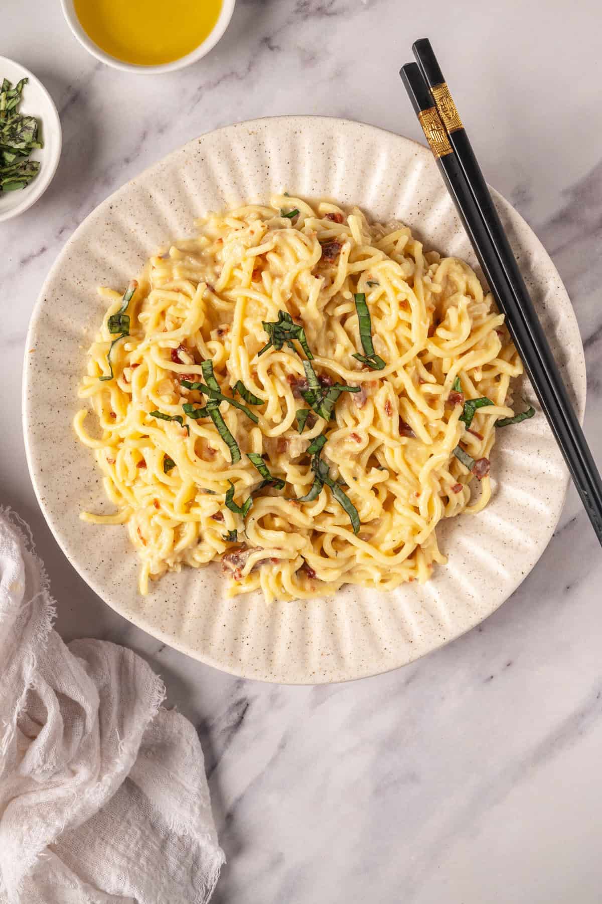 Just as when I make penne alla vodka, I love to add peas to carbonara ramen. Not only are they tasty, but the bright green of the peas adds a nice visual contrast to this dish. Corn kernels, chopped zucchini, baby spinach, and broccoli are other possible additions. I also like to elevate this dish with sundried tomatoes. You can also top it with chopped scallions or chives.