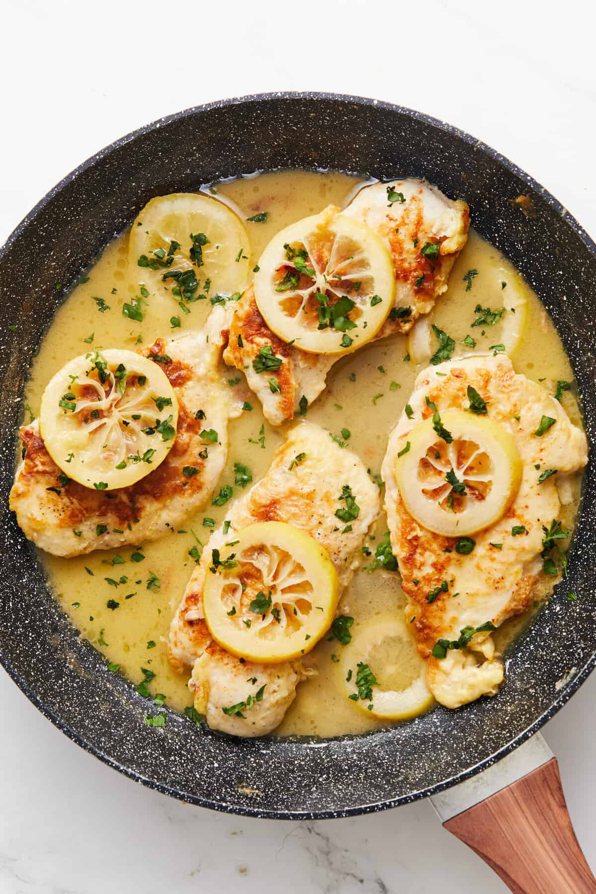 2 large boneless, skinless chicken breasts cut in half horizontally to create 4 thin cutletsSalt to tastePepper to taste3/4 teaspoon garlic powder1/4 cup all-purpose flour for dredging2 large eggs beaten1 1/2 tablespoons milk3 tablespoons olive oil1 large lemon 2/3 sliced into thin rounds and 1/3 for extra juice3 tablespoons unsalted butter divided5 tablespoons dry white wine1 1/3 cups low-sodium chicken brothFresh parsley chopped (for garnish)