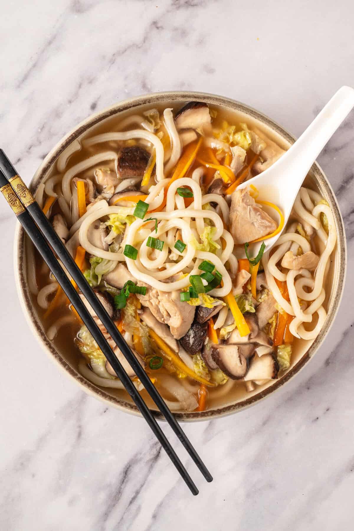 Chicken udon soup is packed with healthy ingredients like cabbage, chicken, mushrooms, carrots, garlic, and ginger. This recipe already calls for low-sodium soy sauce and chicken broth to help keep the salt level low. You can make this dish gluten-free by using gluten-free soy sauce, tamari, or coconut aminos, and udon rice noodles, rice ramen, or any other GF noodles you prefer.