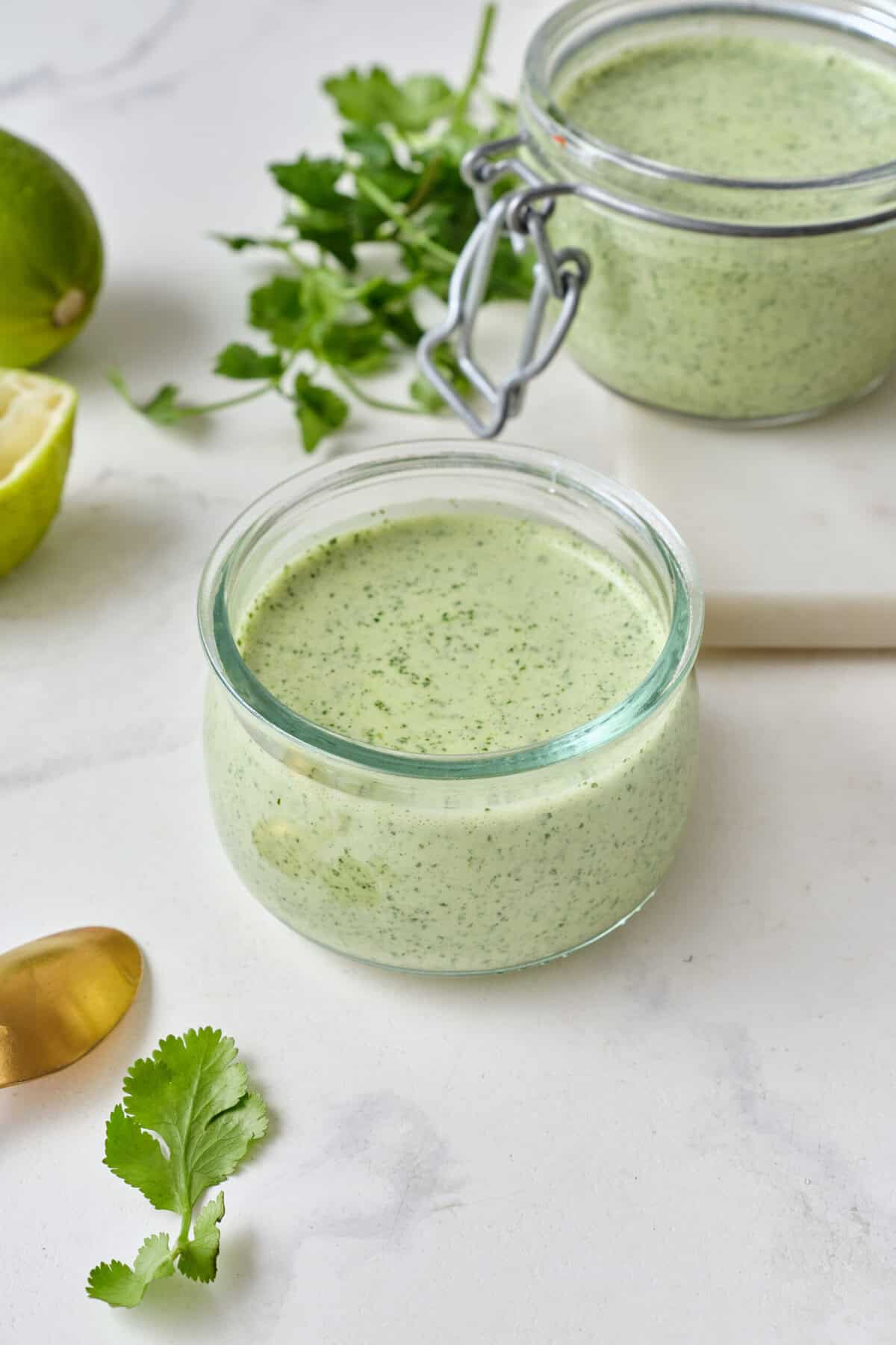 Prepared cilantro-lime sauce can be stored in the refrigerator in an airtight container or glass jar with a tightly fitted lid for up to 5 days. Be sure to shake the jar or stir the sauce well before serving. I don’t recommend freezing the sauce, as it contains mayonnaise and Greek yogurt, both of which can separate and become grainy upon thawing.