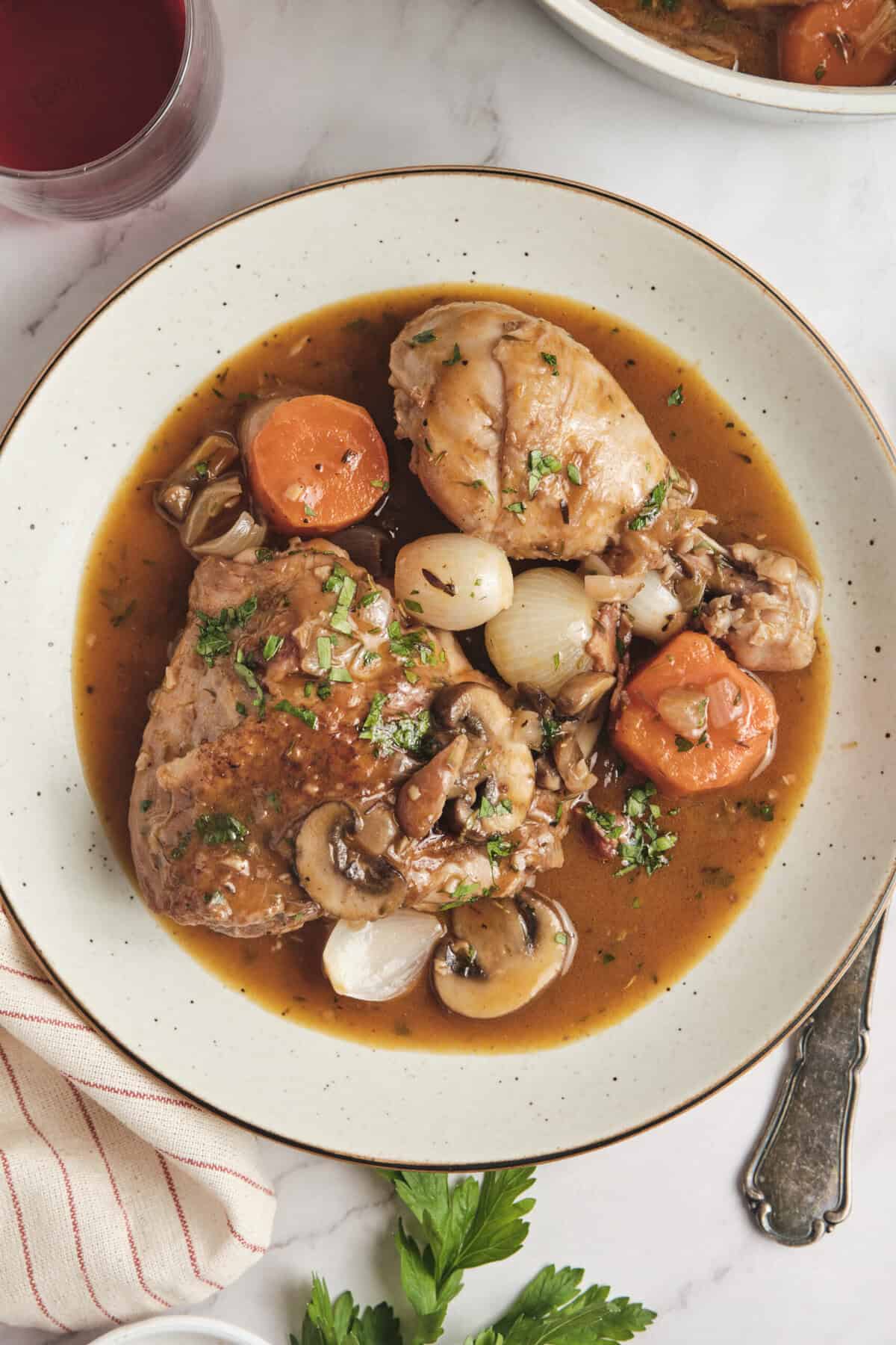 After the oven time, stir the mushrooms and pearl onions into the pot and simmer on the stovetop for an additional 10 minutes or until chicken is cooked through. Discard the bay leaf, adjust salt and pepper if needed, and garnish with chopped parsley before serving.