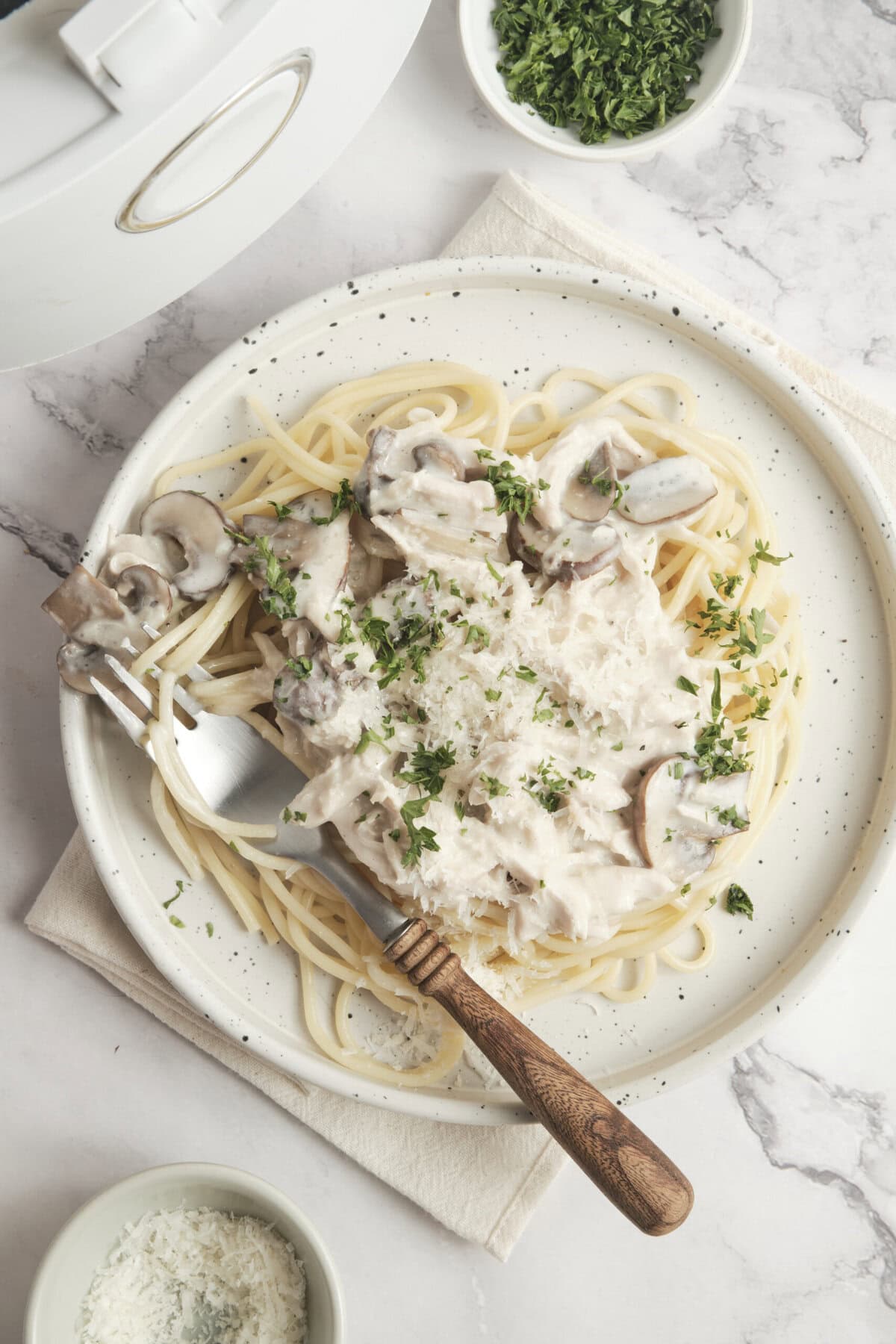 Now that summer is transitioning into autumn, I’m bringing back all of my favorite Crock-Pot recipes—like this delicious chicken tetrazzini. Everything from the fork-tender chicken breast to the creamy, tangy mushroom-packed sauce reminds me why I love Italian-American recipes in the first place. The comforting and hearty elements of Italian-American dishes bring me so much joy, and this chicken tetrazzini recipe covers all the bases.