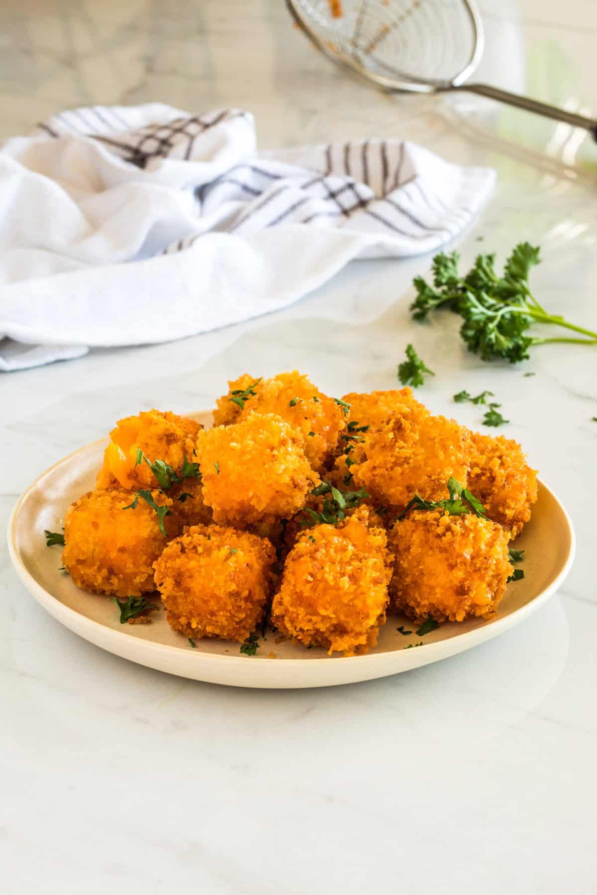Let the fried cheese cool completely before storing it in an airtight container and refrigerating it for up to 4 days. You can also freeze it for up to 2 months in a freezer-safe ziplock bag. Thaw it in the fridge overnight before reheating. To reheat, simply pop in the oven at 350°F for about 10 minutes, until they’re nice and crispy.