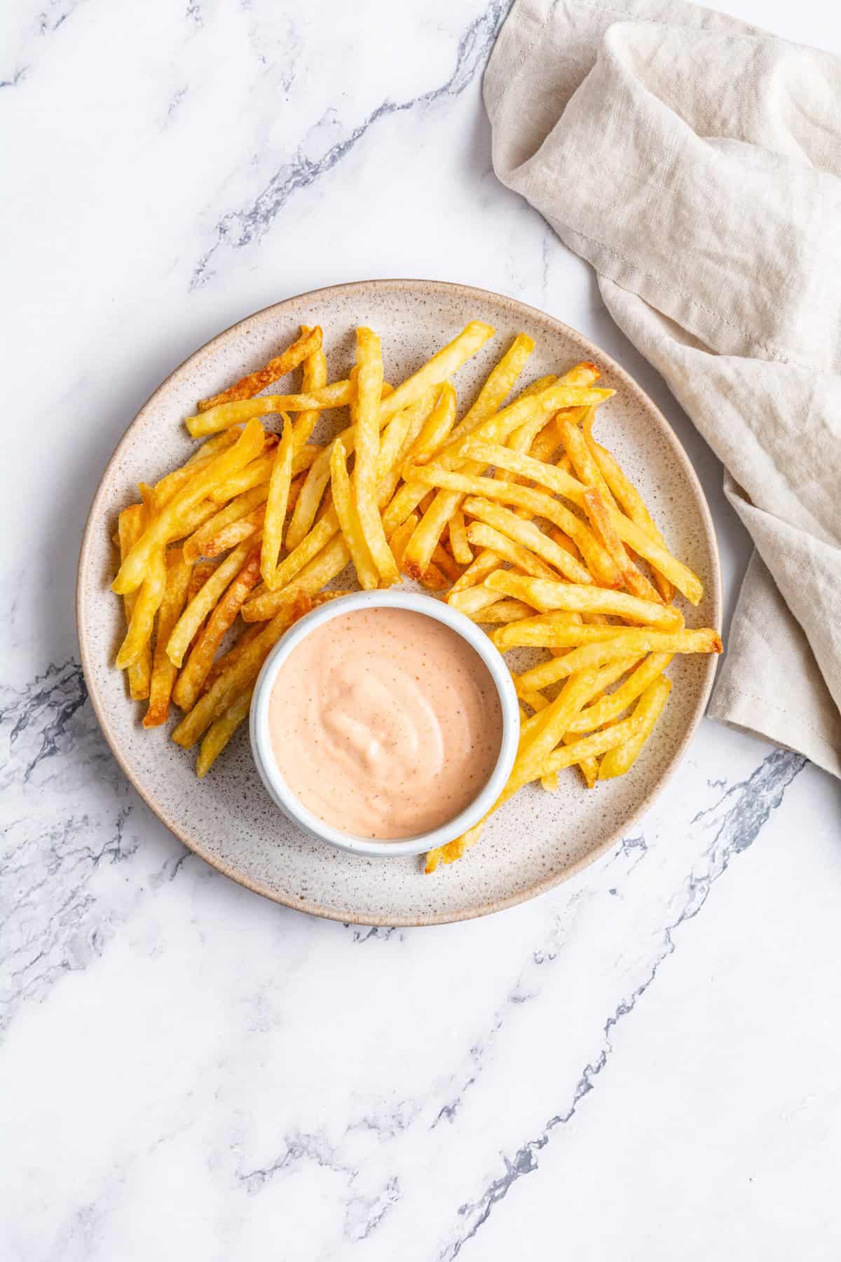 A regional condiment for French fries, its most pared-down version consists of a mixture of mayonnaise and ketchup, with more mayo than ketchup, giving it an orange/pink hue. Add pickle juice and smoked paprika, and it goes to the next level.
