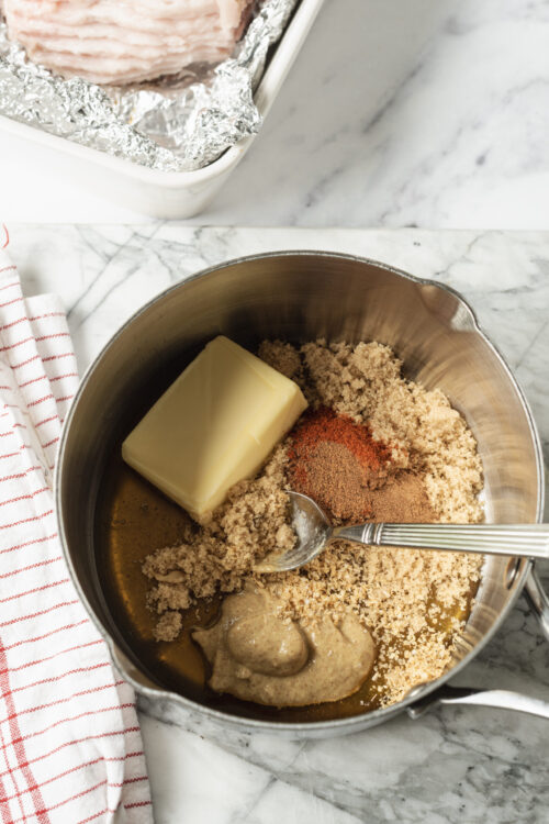 In a small saucepan, combine the honey, brown sugar, butter, mustard, onion powder, cinnamon, nutmeg, cloves, and paprika. Heat over medium-low, stirring until the sugar is dissolved.