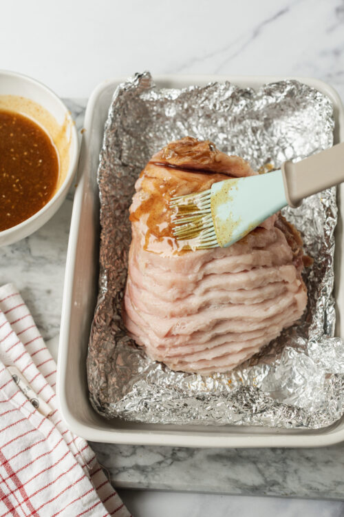 Baste the ham with about 1/3 of the glaze. Make sure to work the glaze in between the slices.