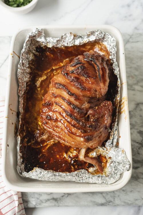 Remove from the oven and let the ham rest for 5 minutes before serving. Garnish with fresh herbs, such as such as thyme, rosemary, or parsley.