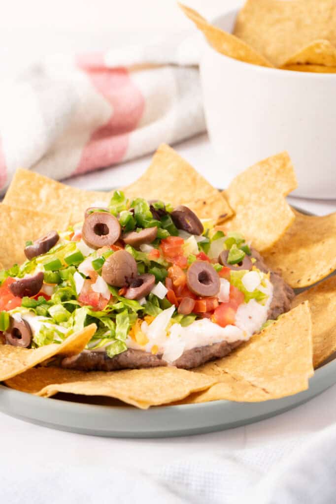 This Mexican dip recipe is what saves me in these surprise potluck situations. It’s such a universally liked dish, I feel confident bringing it to pretty much any gathering. Plus, it takes no time at all to assemble it, as there’s no cooking involved. Hearty refried beans are topped with taco-flavored sour cream, cheese, tomatoes, green onions, lettuce, and black olives. Scoop up this dip with your favorite tortilla chips for a tasty snack that could even double as an easy meal!