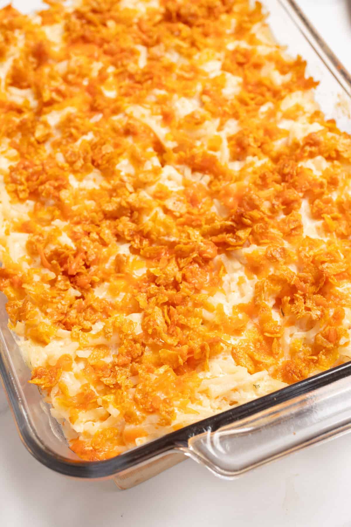 Some people like to go the “funeral potatoes” route and top their casserole with crumbled potato chips. But you can also use crumbled corn chips, rice crackers, or crispy fried onions.