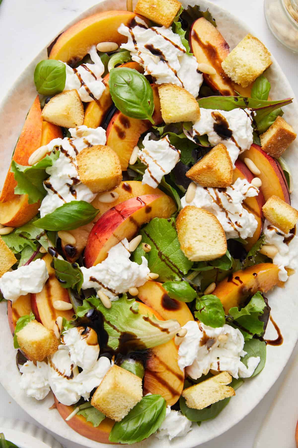 This salad is definitely best enjoyed fresh. While burrata itself can be stored up to 3 days in the fridge, once it’s combined with other salad ingredients, it’s best to consume it within a day or two. If you do store any leftovers, be sure to put them in an airtight container. Keep in mind that once you add dressing to salad greens, they can become soggy, and cut peaches often turn brown after 24 hours.