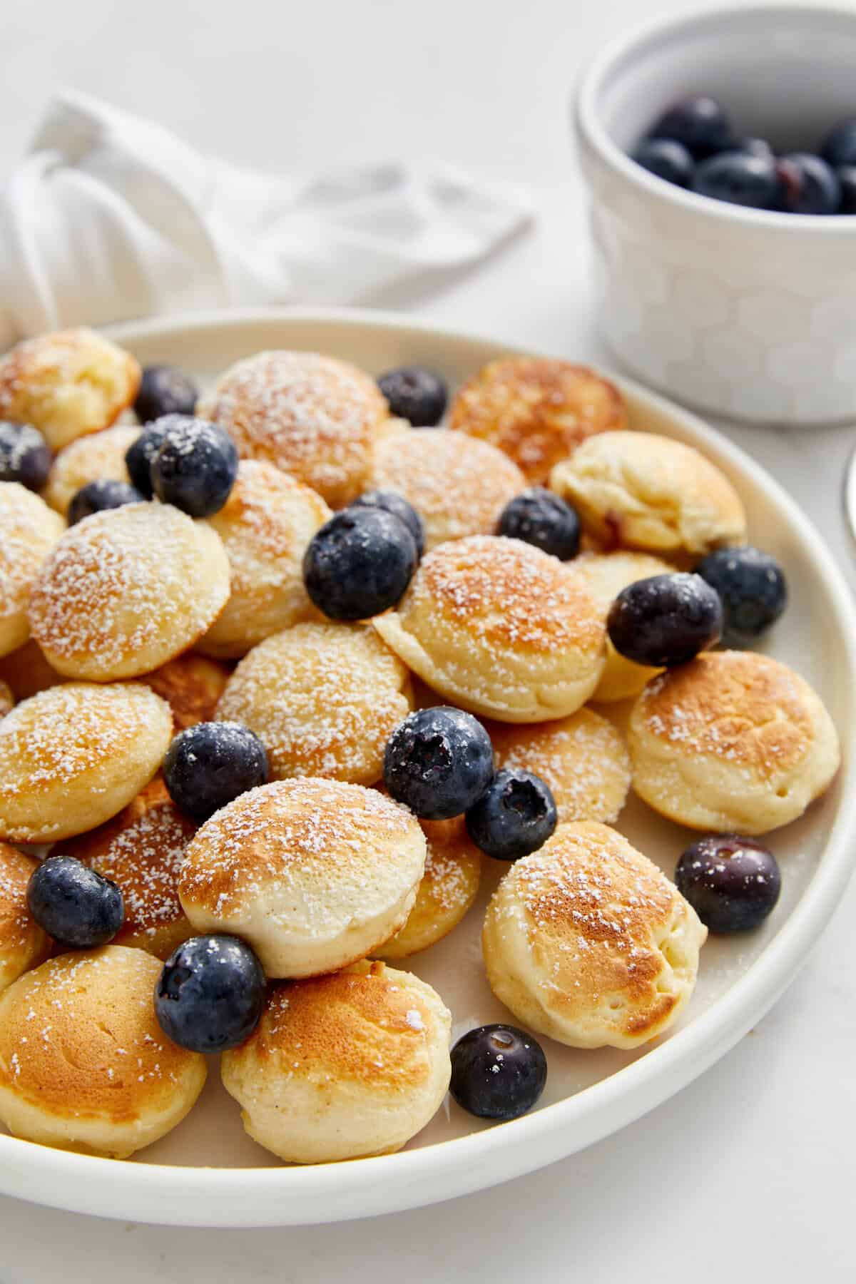In addition to powdered sugar and butter, you can serve poffertjes with honey, maple syrup, icing sugar, Nutella, berries, sliced bananas, or other fresh fruit. Try topping them with Lemon Curd, Chocolate Fondue, Cream Cheese Crêpe Filling, Salted Caramel Sauce, Strawberry Sauce, Chocolate Whipped Cream, and Orange Curd. Or, add a side of Candied Bacon, some Air-Fryer Breakfast Potatoes, and a refreshing Coffee Smoothie for the perfect weekend brunch.