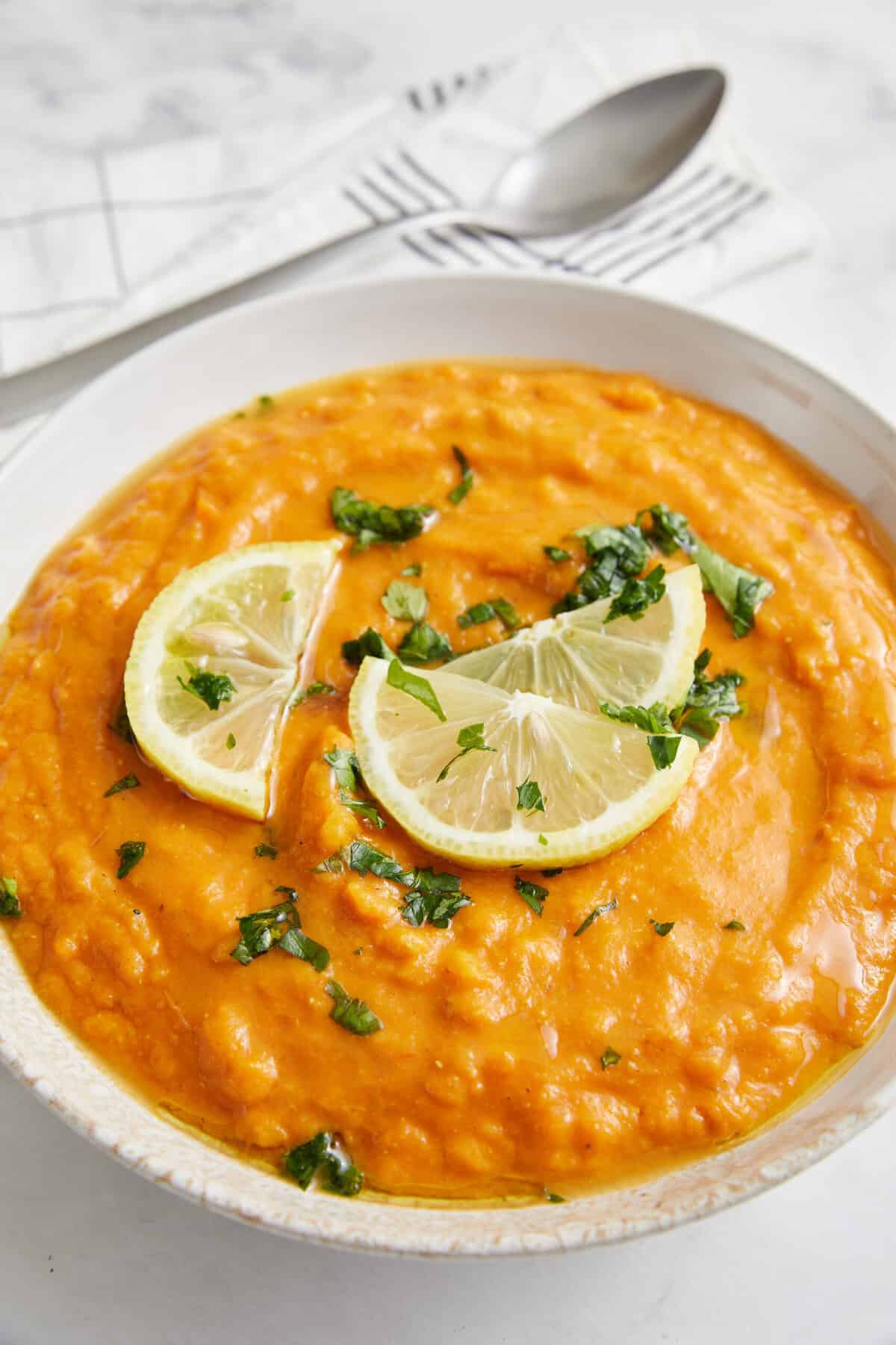 Want to elevate your meal to restaurant status? Garnish red lentil soup with freshly chopped parsley and thin slices of lemon or lime. Serve over Basmati Rice or Instant Pot Quinoa. Then, enjoy it with a side of Roasted Broccoli, warm Naan, or Jerusalem Salad. Red lentil soup has a unique set of flavors that pairs well with a wide array of sides.