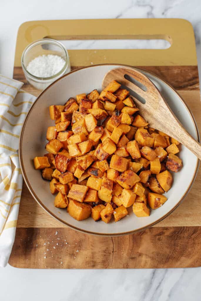 Sweet potatoes go perfectly with other colorful dishes. I love to serve them with grain bowls, salads, and alongside proteins like this Lemon Roasted Chicken or this Honey-Glazed Salmon. Need some more inspiration? Serve these roasted sweet potatoes with a bright and creamy Broccoli Salad, some colorful Kale Soup, or some gorgeous Keto Stuffed Peppers! If you’re looking to complement the subtle sweetness of your roasted sweet potatoes, try a little something salty like a Spinach Cheese Quiche.