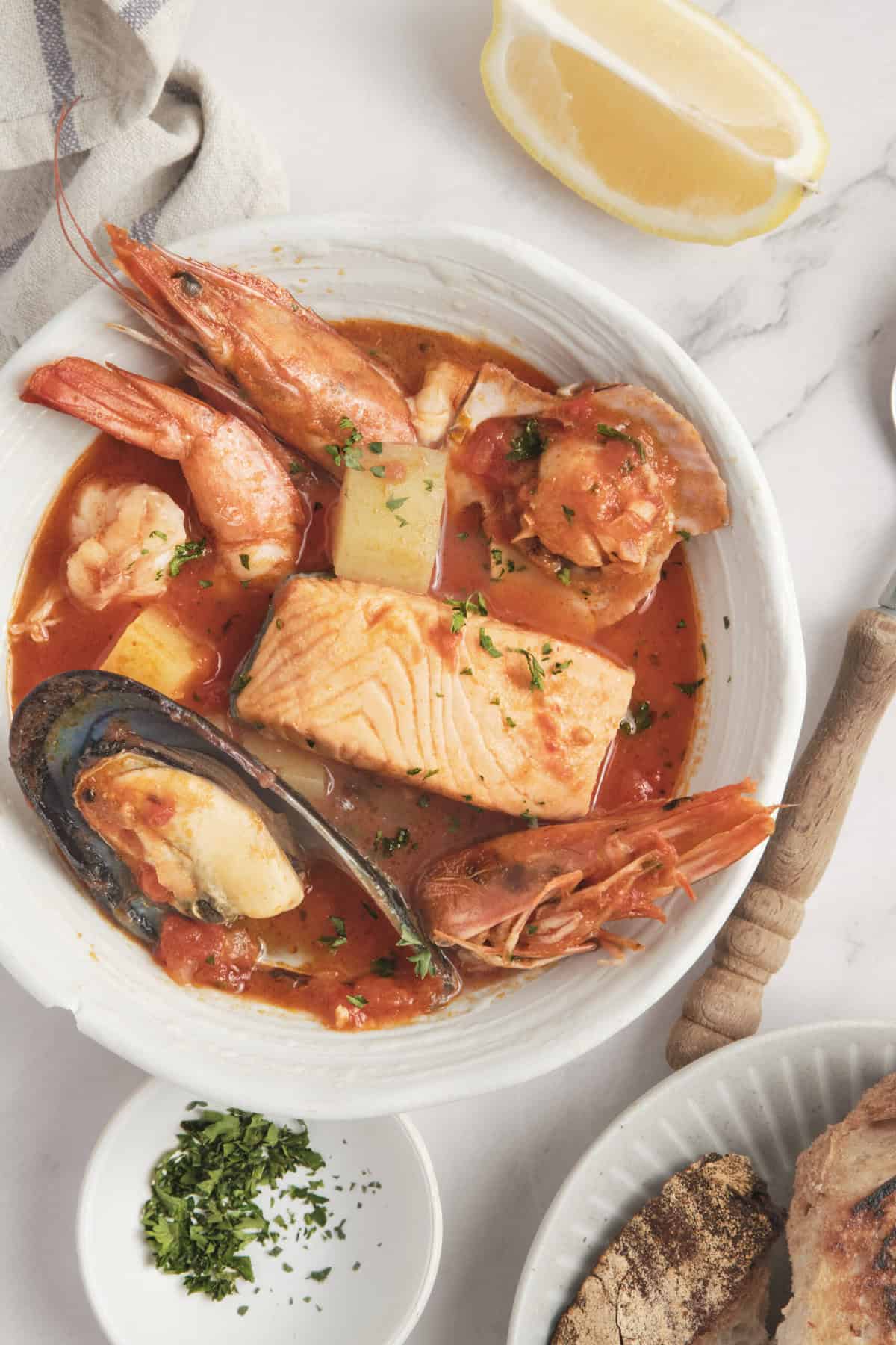 If you have any leftover seafood stew, you can store it in an airtight container in the refrigerator for up to 3 days. You can also store it in the freezer for up to 2 months. To defrost it, I recommend leaving it in the fridge until it’s completely thawed. You can reheat it on the stovetop in a pot over medium heat until it’s warmed through. Garnish with some chopped parsley and a squeeze of lemon juice to refresh the flavor.