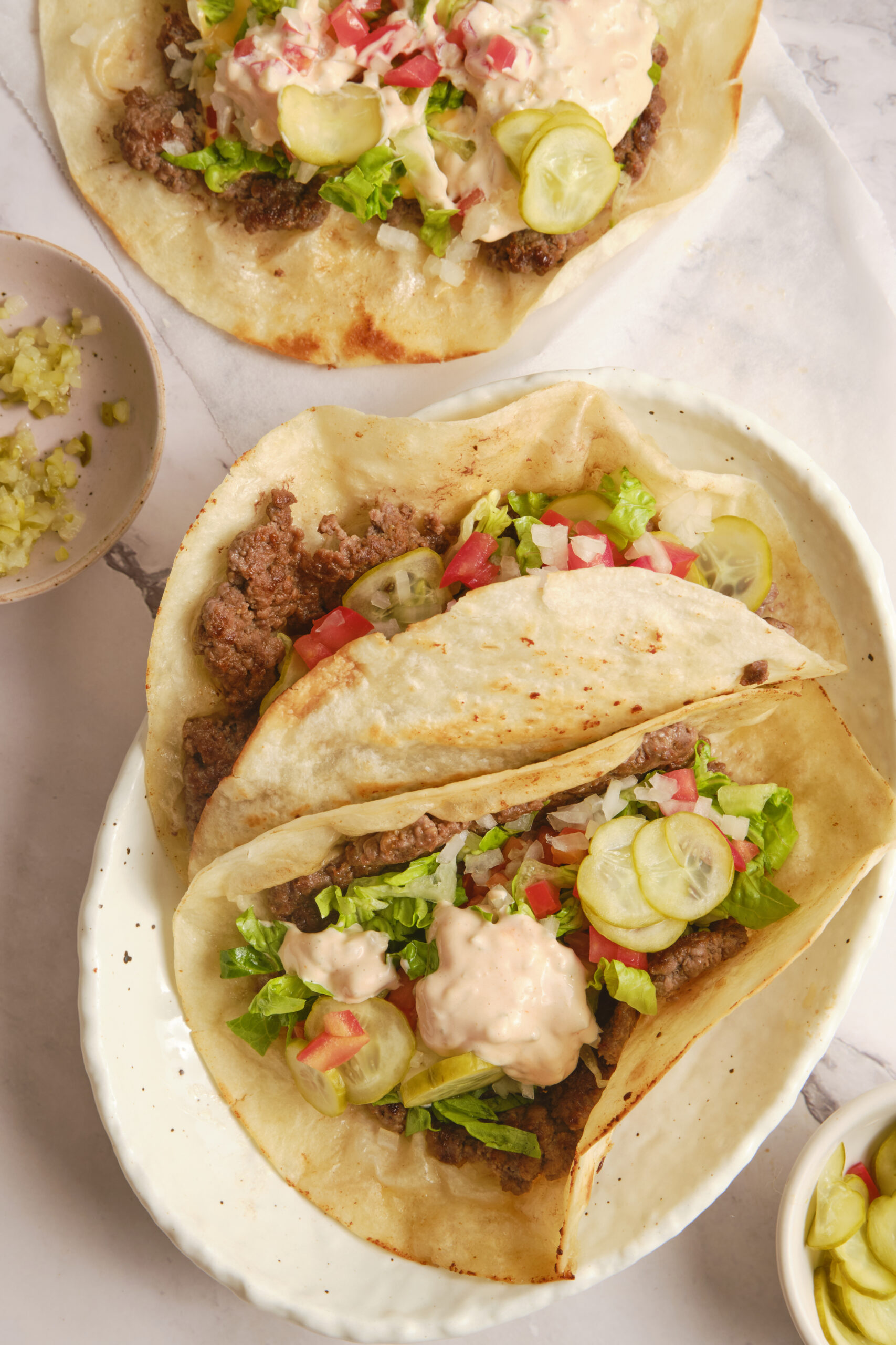 My go-to burger order is medium, topped with American cheese, lettuce, pickles, and lots of salt. I’ll take veggies on it, too, like avocados or tomatoes. I never use just ketchup, but I love a special sauce. As for my taco preferences, I always order soft-shell tortillas, beef, cheese, and lettuce. So, I basically dreamed up this smash burger taco to combine the best parts of two of my favorite fast-food dishes. I love the savoriness of the beef patty, topped with melty cheese, the sweet yet zesty sauce, the crunch of fresh lettuce and tomato, all wrapped up in the perfect handheld soft taco shell.