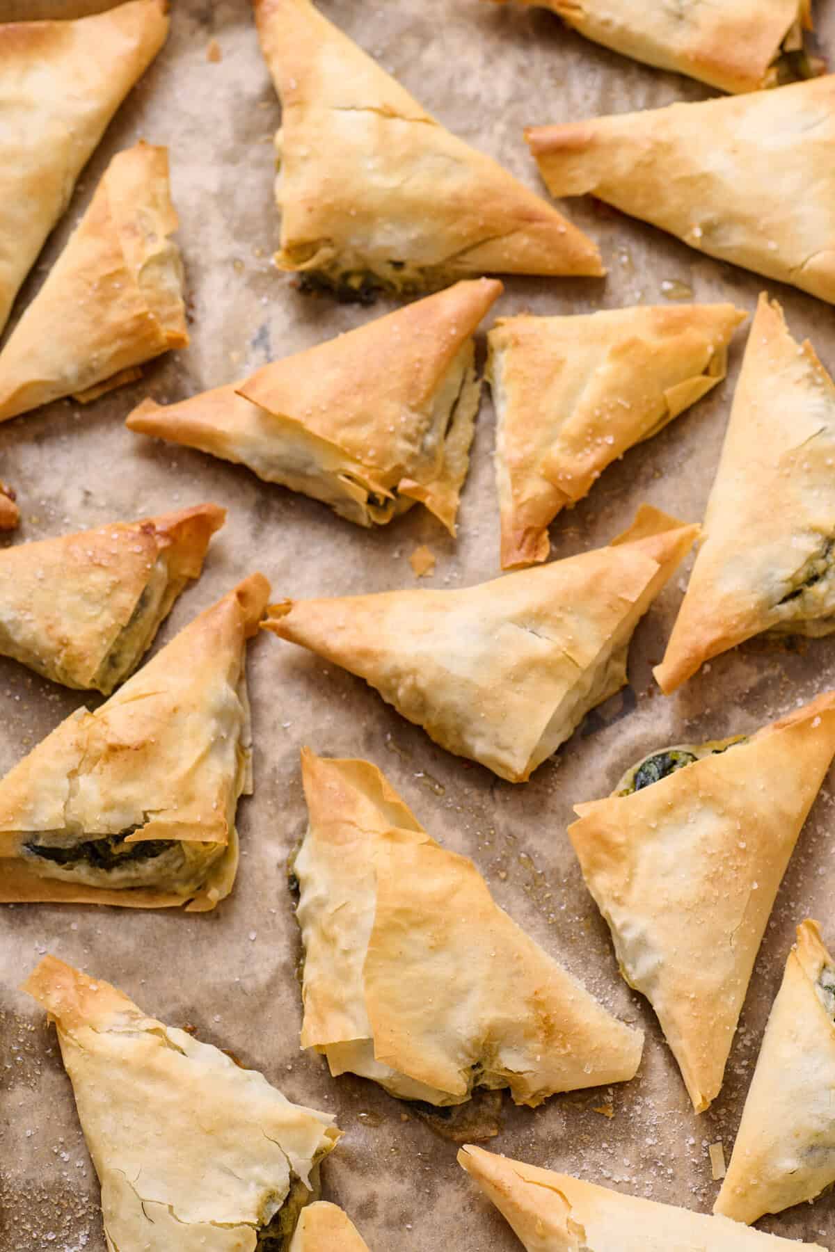 This recipe uses phyllo dough, which is thinner and more delicate than traditional pie crust. While the triangles are not fried but instead oven-baked, it’s still best to enjoy them in moderation. It’s possible to replace your phyllo dough with a gluten-free version, although this may alter the texture. To turn your triangles vegan, use vegan butter instead of real butter, and replace feta with a plant-based alternative.