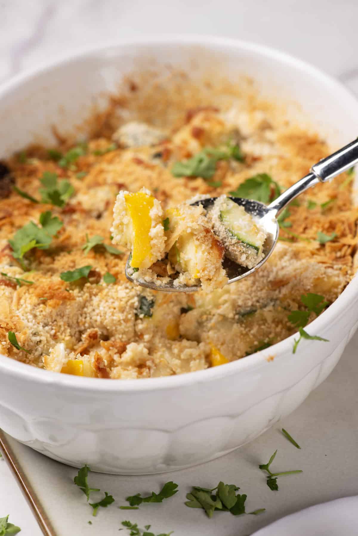 Once cooled, the squash and zucchini casserole can be covered and refrigerated for up to 4 days, or you can transfer it to freezer-safe containers and freeze for 3 months. Thaw in the fridge overnight before reheating in the oven at 350°F for 20 minutes, or until it’s hot and bubbly. Keep an eye on it throughout the warming process to make sure the top doesn’t burn. Cover it loosely with aluminum foil if the breadcrumb topping starts getting dark before the rest of the casserole is heated through.