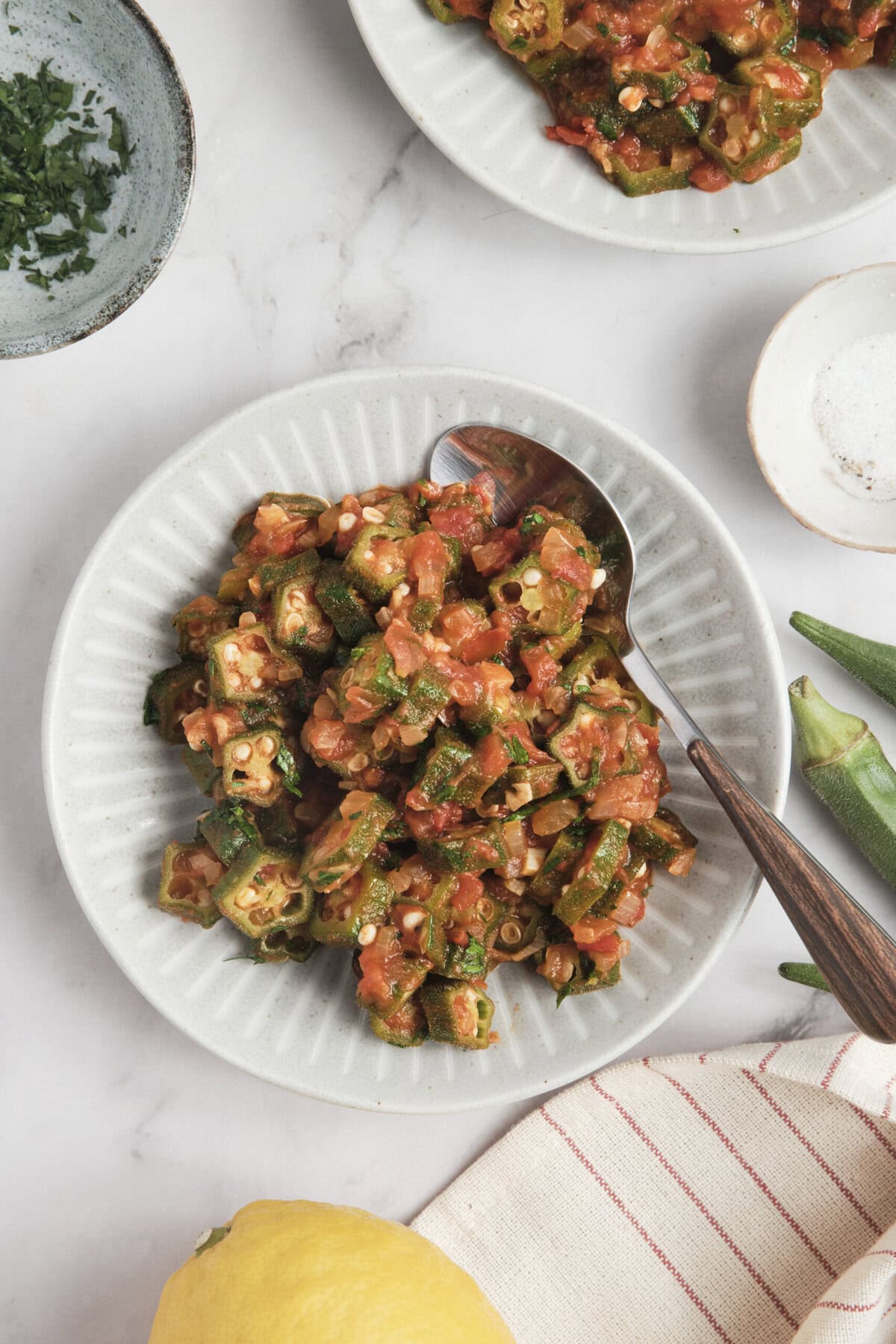 The key to making sure okra stays soft and moist without being slimy or soggy is to include plenty of acidity. That’s why this recipe calls for both tomatoes and lemon juice. All that acidity not only prevents sliminess—it also lowers any lingering bitterness in the plant. At the end of cooking, you have a tender, juicy side dish bursting with salty and tangy flavors.