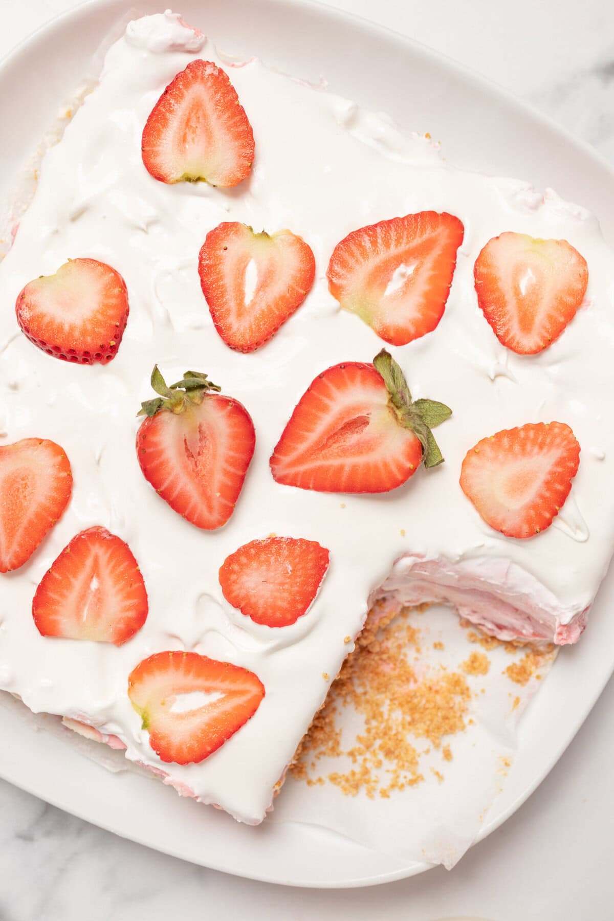 Cover leftover strawberry delight tightly with plastic wrap or a tight-fitting lid. Alternatively, you can transfer leftovers to an airtight container. Refrigerate leftovers for up to 4 days. The longer it sits, the softer the crust will become due to the natural juices of the fruit. But it will still taste great. If freezing, place leftovers in a freezer-safe dish and cover with a layer of plastic wrap directly on the dessert to prevent freezer burn before closing the container. Freeze it for up to 3 months and defrost the dessert in the refrigerator. The textures will likely change, but it will still taste great.