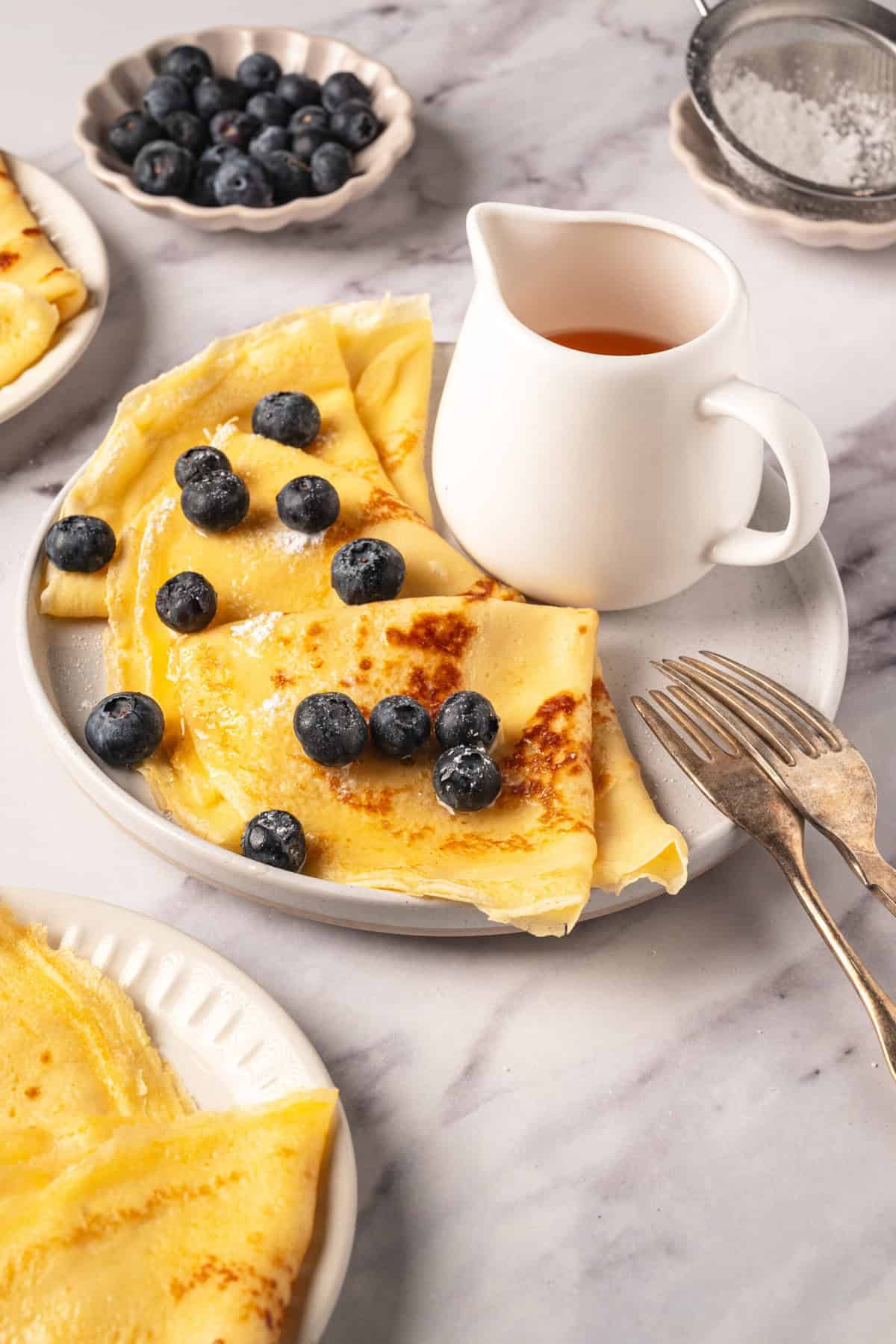 These Swedish pancakes are practically begging to be dressed up with whatever makes you happy. Traditionally, they’re served with lingonberry jam and whipped cream, and Swedes often eat them for lunch or dessert. You can treat these like dessert and top them with chocolate-hazelnut spread, sliced bananas, crushed hazelnuts, or a simple mixture of lemon juice and sugar. Warm berries with crème fraîche are also fantastic on these. If you’re in the mood, try Greek yogurt, hemp hearts, and your favorite granola. I like to eat these with half a cup of blueberries, a dollop of cottage cheese, and a generous drizzle of maple syrup. For savory pancakes, consider a thin slice of ham with a little shredded Swiss or Gruyère cheese.