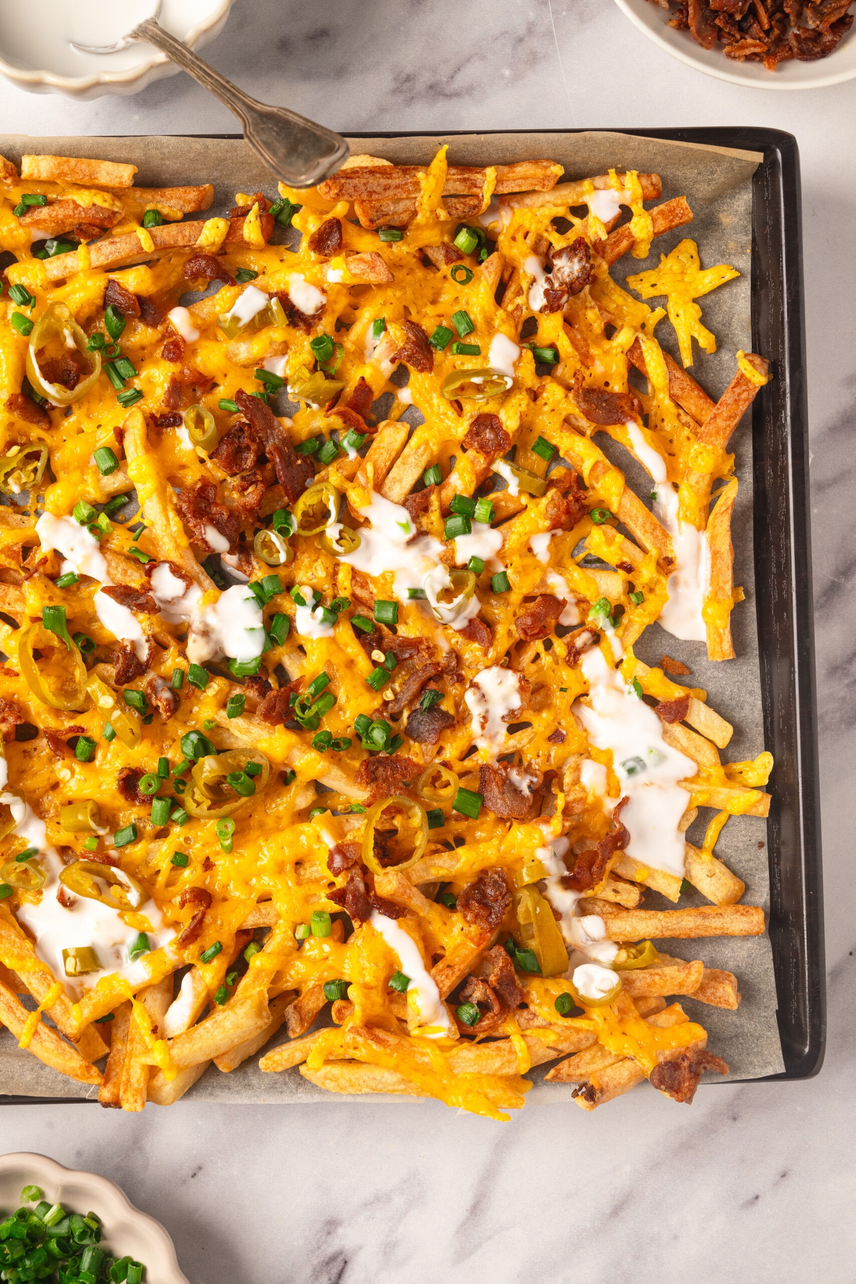 Off the bat, this snack—or meal, however you want to look at it—isn’t necessarily the healthiest around, given its use of fried food and some high-fat ingredients like cheese and bacon. However, our banes are also our blessings, they say, and those same high-fat ingredients help pack a protein punch while baking your fries, as our recipe calls for, rather than deep-frying them avoids the additional unneeded fat and grease, allowing you to focus on balance.