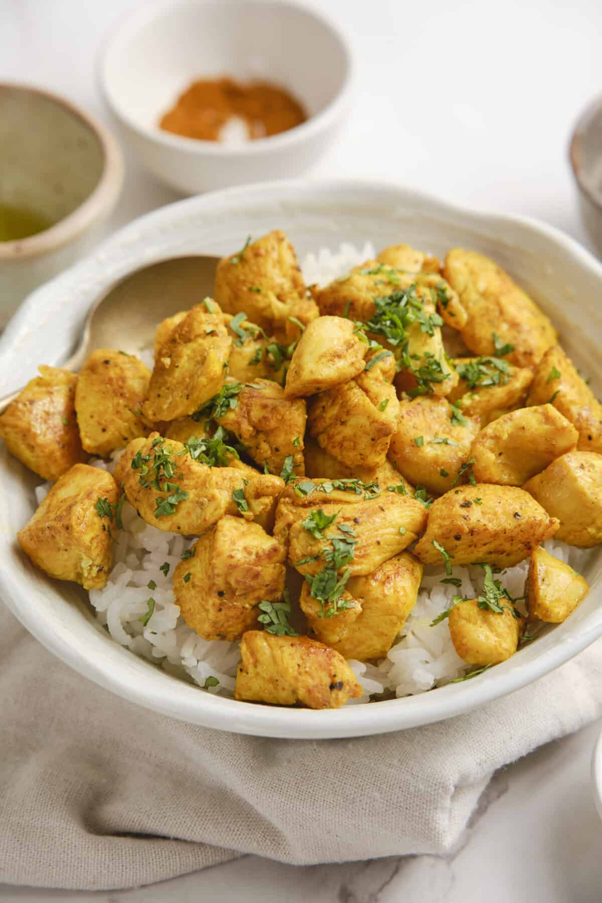 Turmeric is one of my favorite spices for both its vibrant color and earthy taste. When you add it to chicken, it really shines! Inspired by South Asian cuisine, this turmeric chicken recipe is a great way to spice things up for dinner without overdoing it. It delivers just the right balance of earthiness, warmth, and zest for a fast and easy weeknight meal that’s bursting with flavor. Best served on a bed of rice or noodles, this lean main dish can introduce you and your loved ones to a signature style of Eastern cooking.